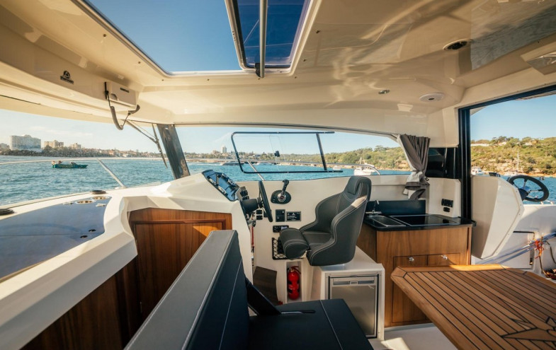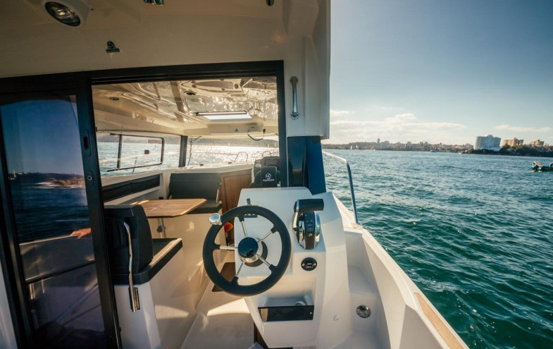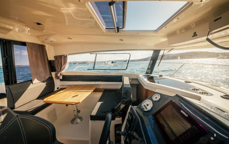 Outside steering position, additional windscreen wiper, windscreen washer, trim tabs, kitchen cabinets, sliding roof, front Maxwel windlass, remote control for windlass, deck shower, side benches, cushions for rear benches, WEBASTO heating system, shore power socket, hot water tank, bow thruster, searchlight, extra battery with selector switch, Lowrance VHF Radio electronic pack, Lowrance HDS with sounder, etc.